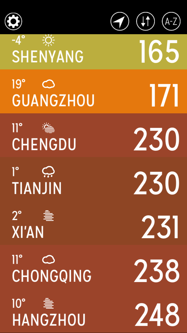 China’s Ministry of Environmental Protection (MEP) is responsible for measuring the level of air pollution in China. As of 1 January 2013, MEP monitors daily pollution level in 163 of its major cities. The API level is based on the level of 6 atmospheric pollutants, namely sulfur dioxide (SO2), nitrogen dioxide (NO2), suspended particulates smaller than 10 μm in aerodynamic diameter (PM10), suspended particulates smaller than 2.5 μm in aerodynamic diameter (PM2.5), carbon monoxide (CO), and ozone (O3) measured at the monitoring stations throughout each city. Quelle: Wikipedia