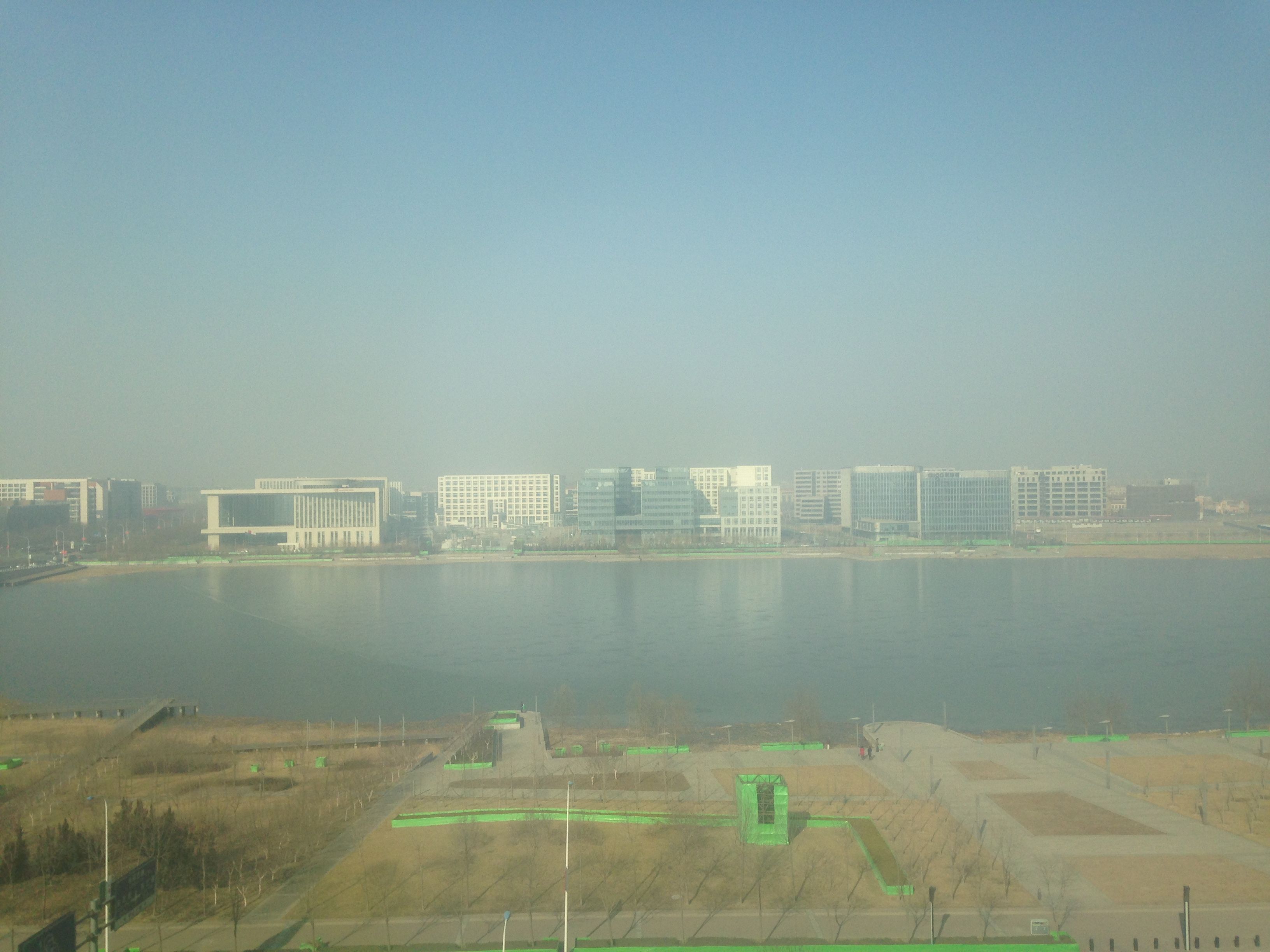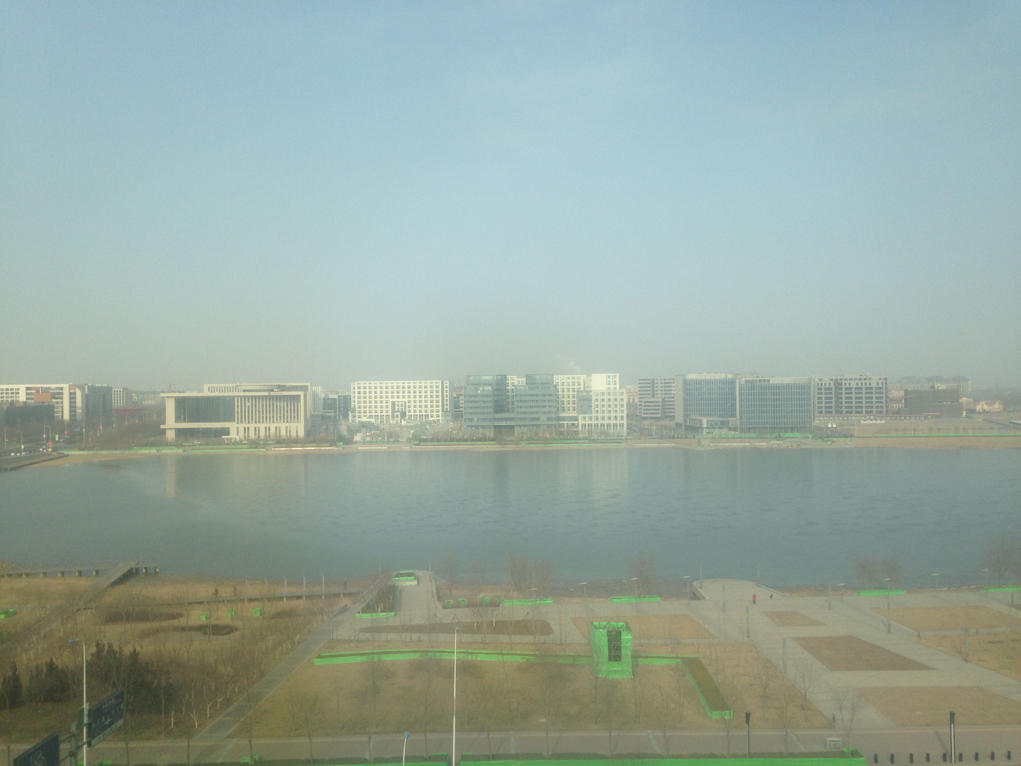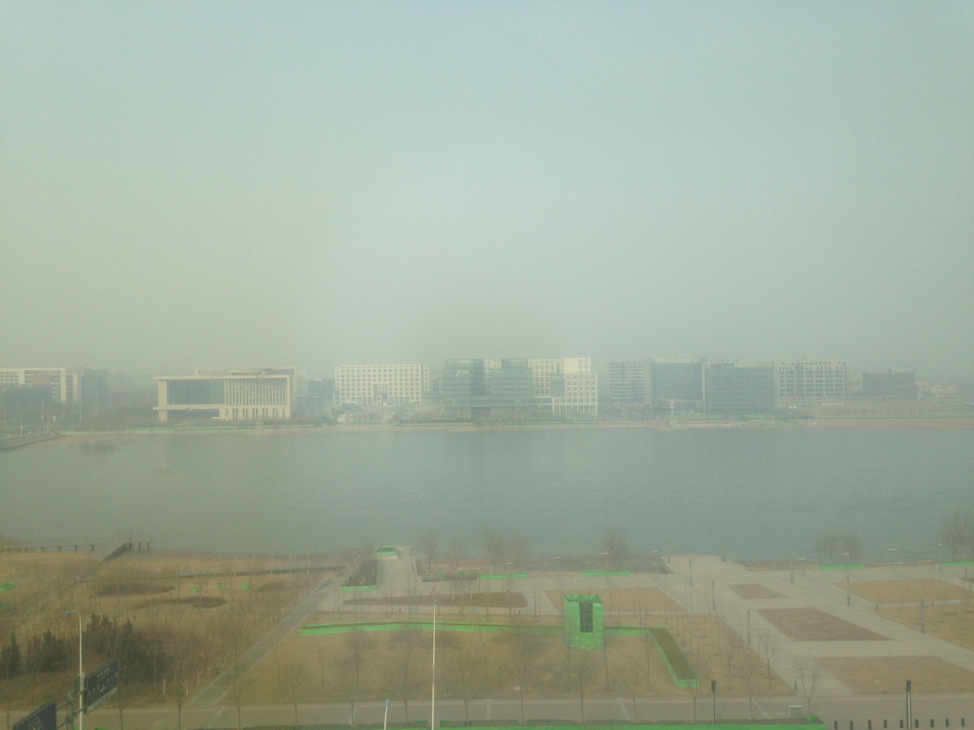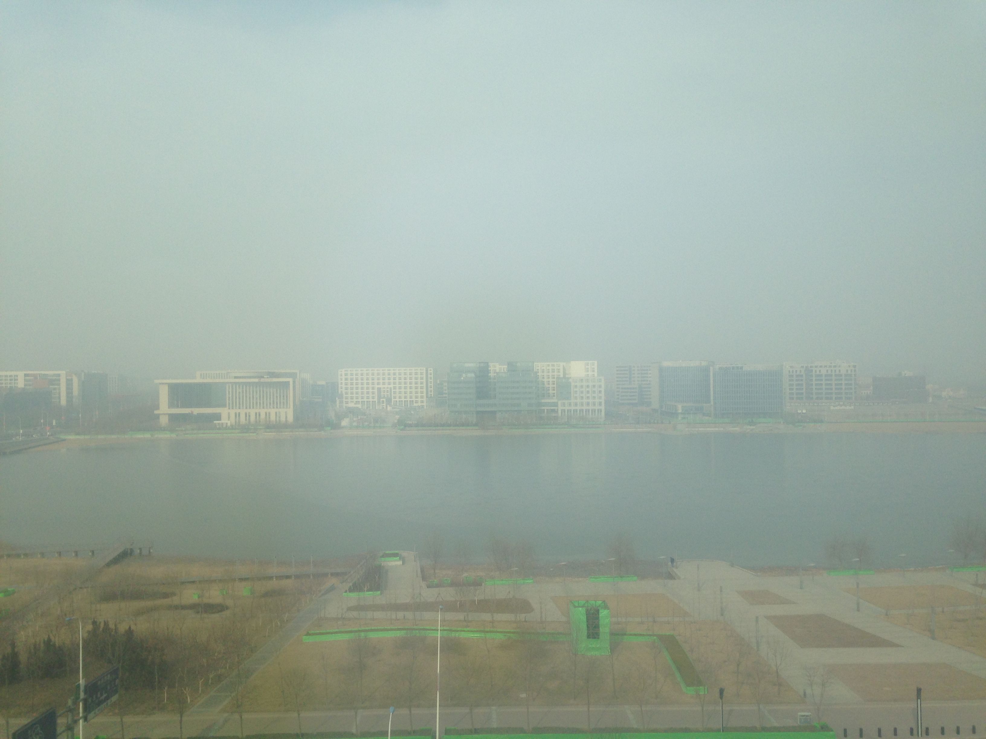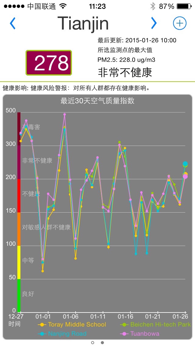 Wie sich die einzelnen Werte real auswirken, erkennt man an unserem täglichen 12 Uhr Foto, das wir aus unserem Zimmer aufgenommen haben. Die Luftwerte sind in der Bildunterschrift angegeben und die Bilder von niedrigem nach hohem AQI sortiert. Interessanterweise schwankt der AQI recht regelmäßig (siehe letztes Bild der chinesischen App). Welche Korrelation dahinter liegt, konnte ich noch nicht ergründen (Anstieg ab Montag, Abfall am Wochenende?).