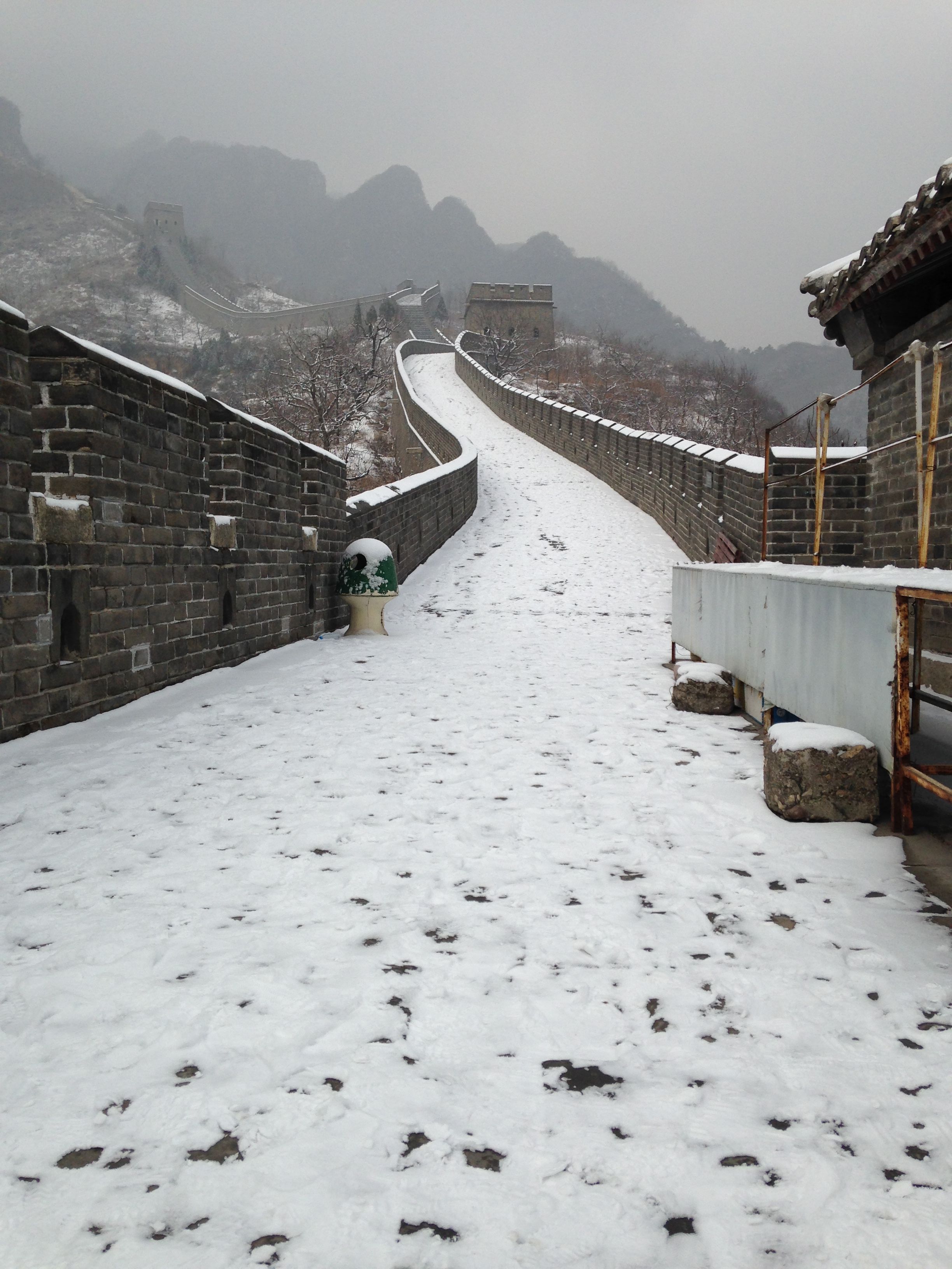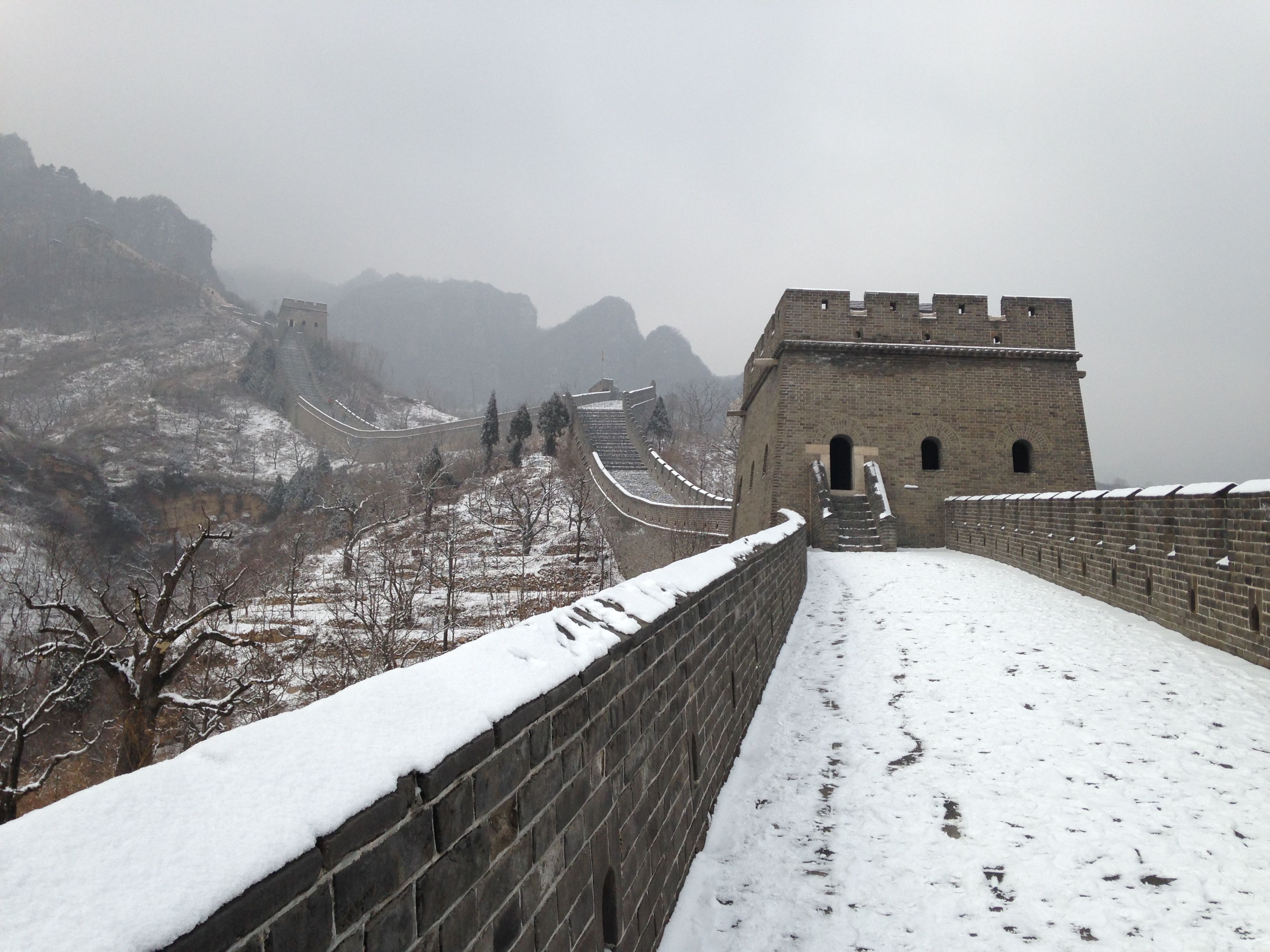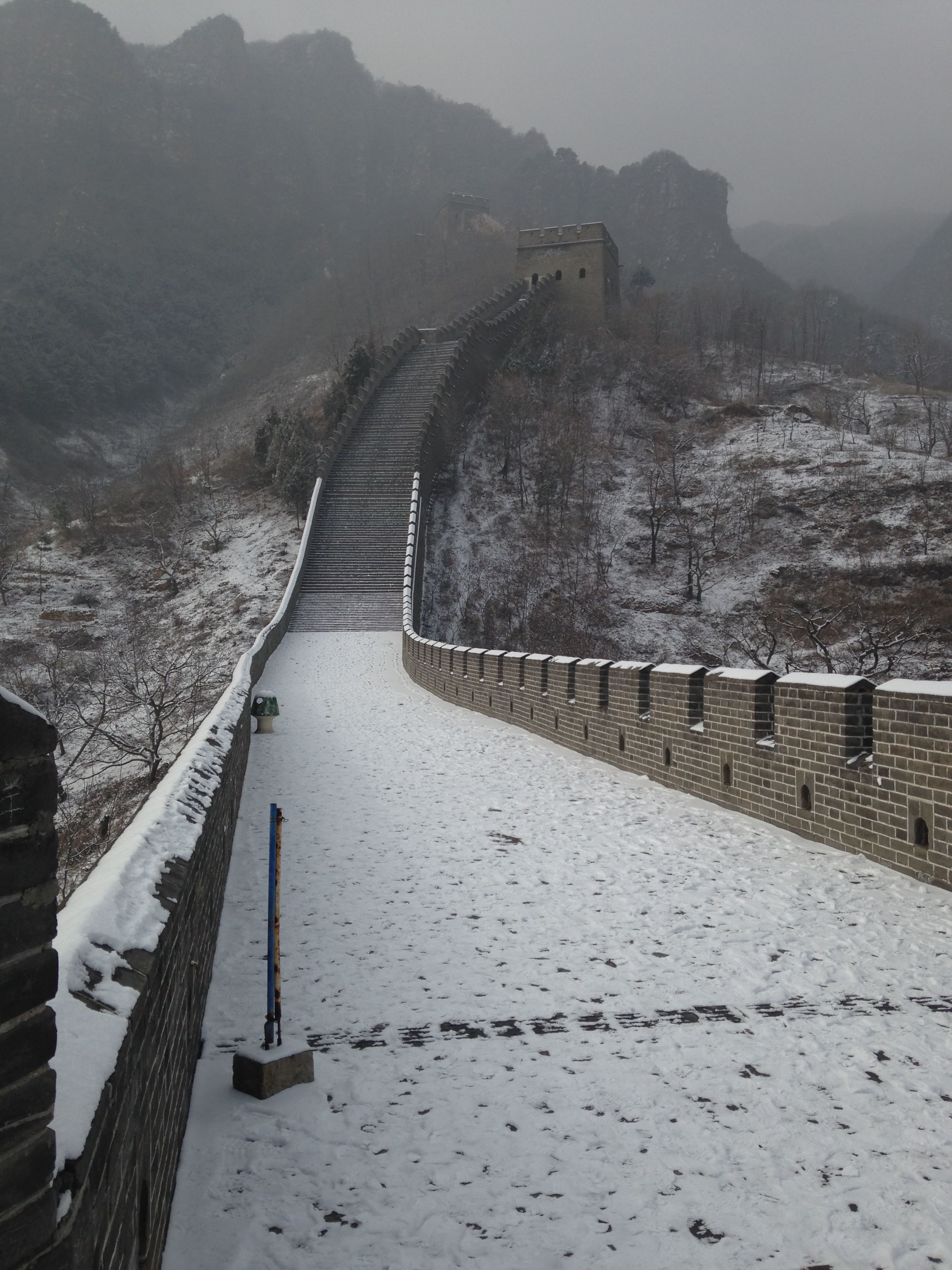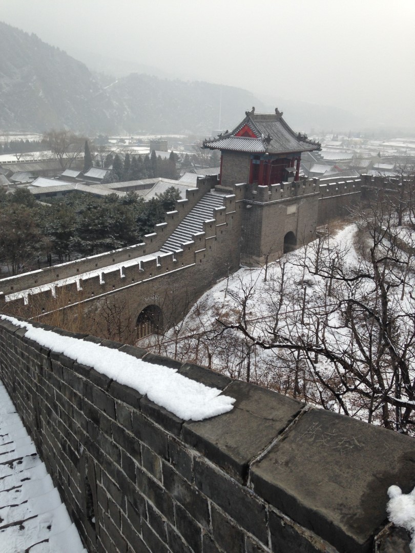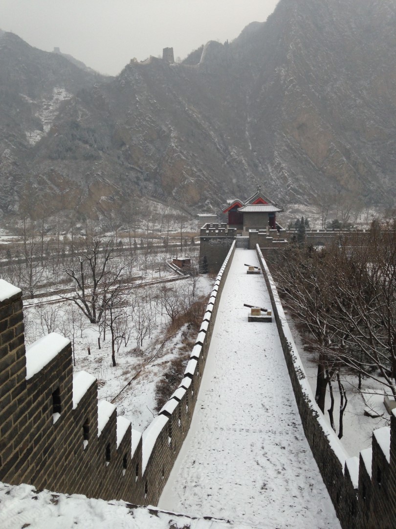 Wir zahlten die 35 ¥ Eintritt und liefen durch eine kleine Parkanlage zum Aufgang der Mauer. Eigentlich wollten wir die längere Route wählen (3 Stunden eine Richtung) – allerdings sahen wir dann, dass wir dabei ca. 1.000 Höhenmeter bewältigen mussten. Angesichts unserer schlechten Ausrüstung entschieden wir uns dann für die kürzere, aber nicht weniger anstrengende Route, in die entgegengesetzte Richtung. Wir passierten 4 Wachttürme bis die Mauer nicht mehr begehbar war und wir leider umkehren mussten 🙂 Der Rückweg stellte sich als nicht weniger schwierig dar, aufgrund der ungleichmäßigen Stufen (manche gingen bis zum Knie, manche nur bis zum Knöchel), die durch den Schnee schön glatt geworden waren. Nach 2 Stürzen war die Schlitterpartie beendet und wir kamen einigermaßen heil, aber verfroren, unten am Ausgangspunkt an.
