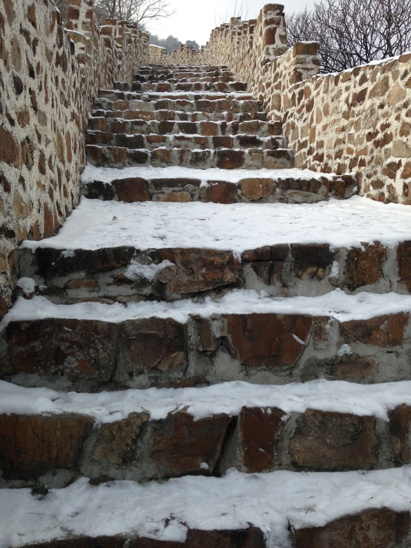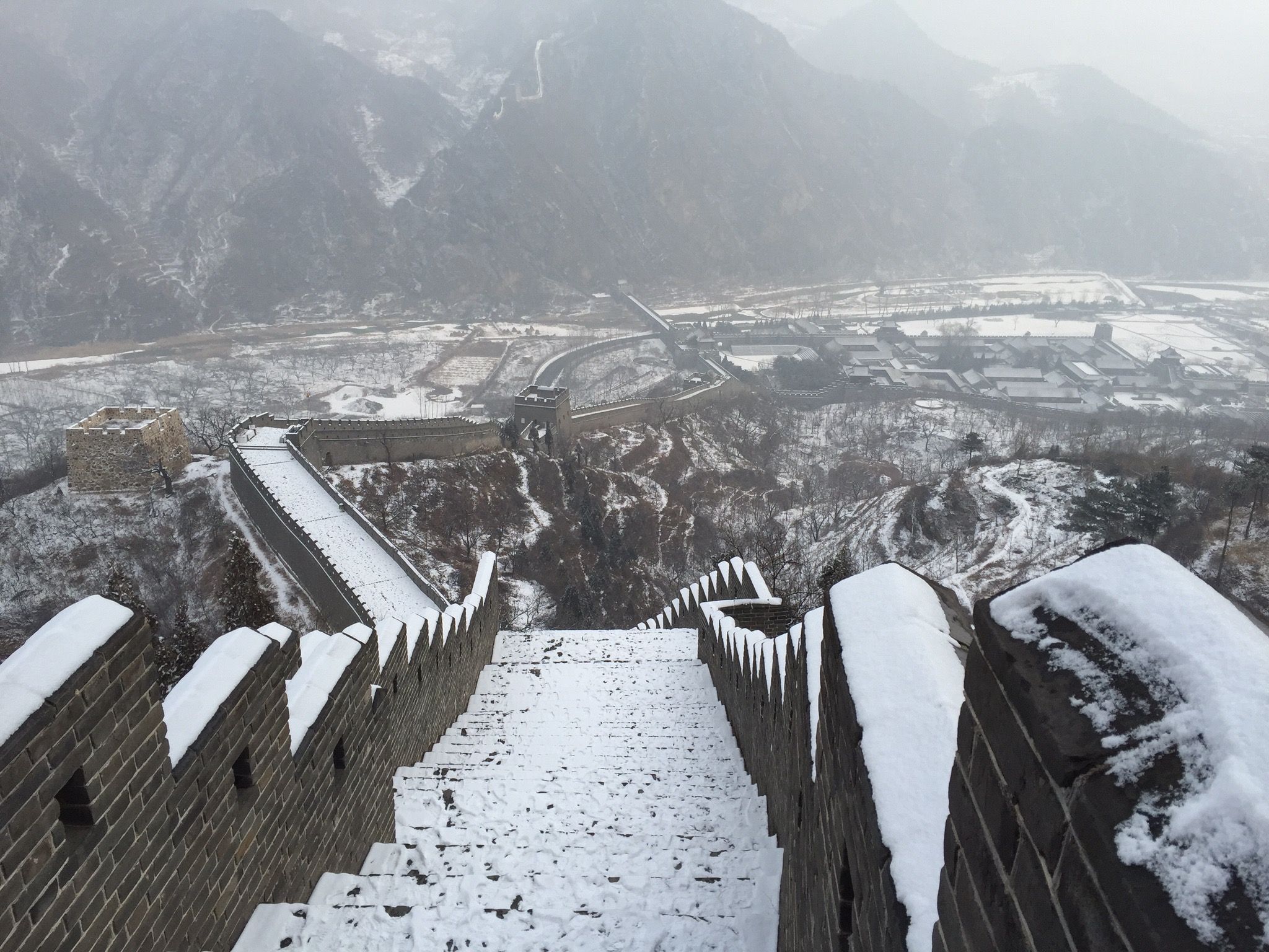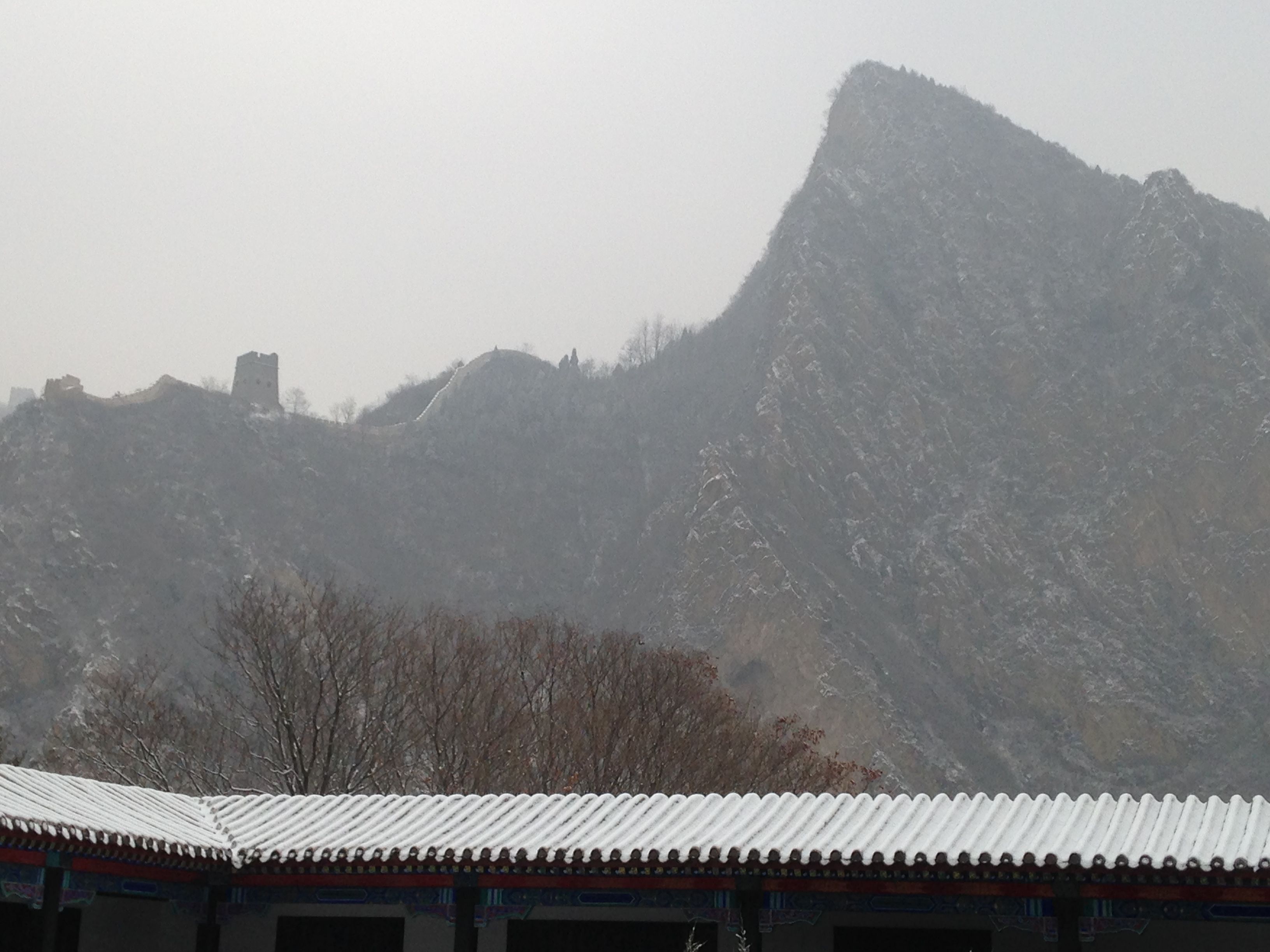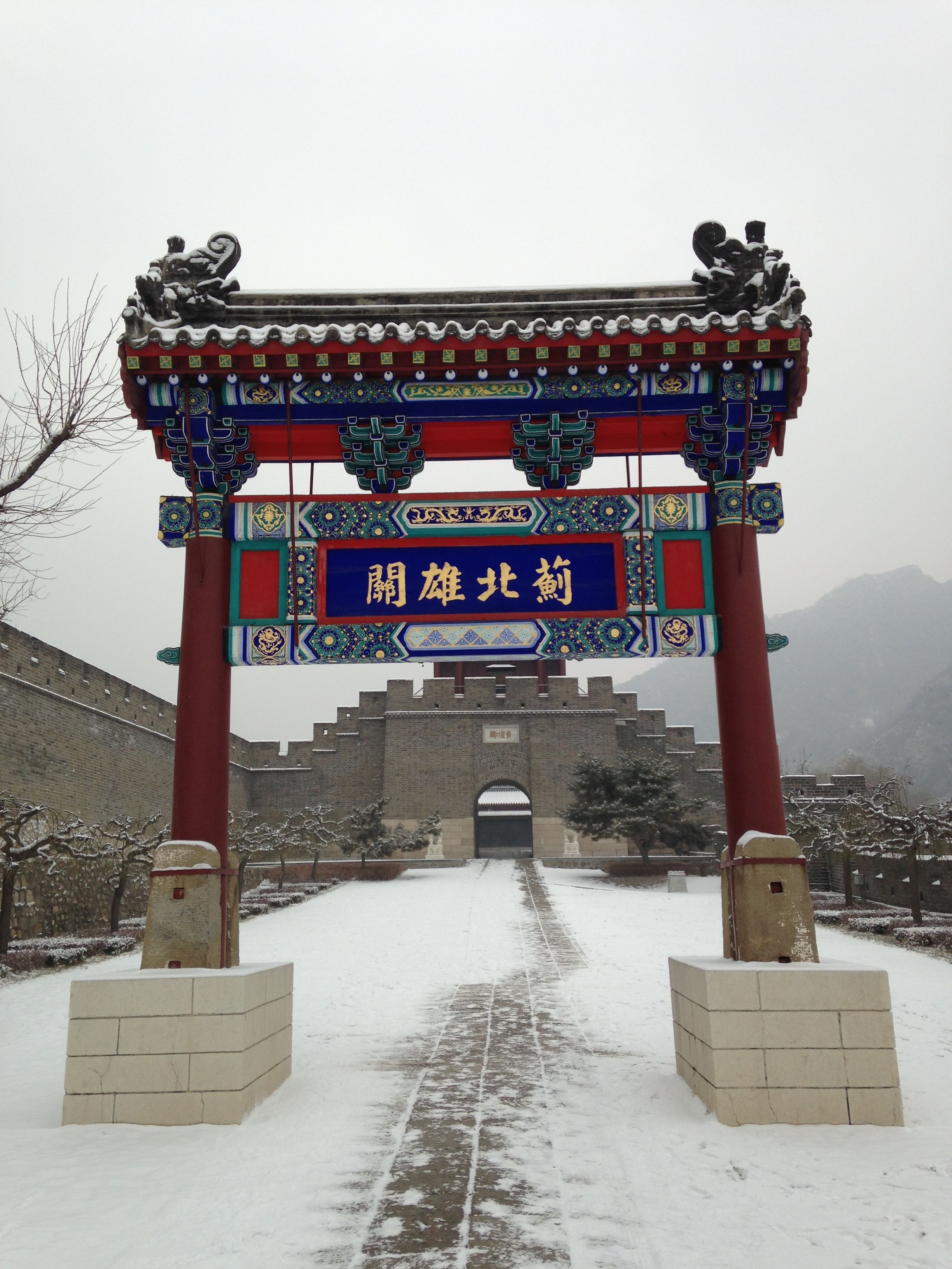 Wir zahlten die 35 ¥ Eintritt und liefen durch eine kleine Parkanlage zum Aufgang der Mauer. Eigentlich wollten wir die längere Route wählen (3 Stunden eine Richtung) – allerdings sahen wir dann, dass wir dabei ca. 1.000 Höhenmeter bewältigen mussten. Angesichts unserer schlechten Ausrüstung entschieden wir uns dann für die kürzere, aber nicht weniger anstrengende Route, in die entgegengesetzte Richtung. Wir passierten 4 Wachttürme bis die Mauer nicht mehr begehbar war und wir leider umkehren mussten 🙂 Der Rückweg stellte sich als nicht weniger schwierig dar, aufgrund der ungleichmäßigen Stufen (manche gingen bis zum Knie, manche nur bis zum Knöchel), die durch den Schnee schön glatt geworden waren. Nach 2 Stürzen war die Schlitterpartie beendet und wir kamen einigermaßen heil, aber verfroren, unten am Ausgangspunkt an.