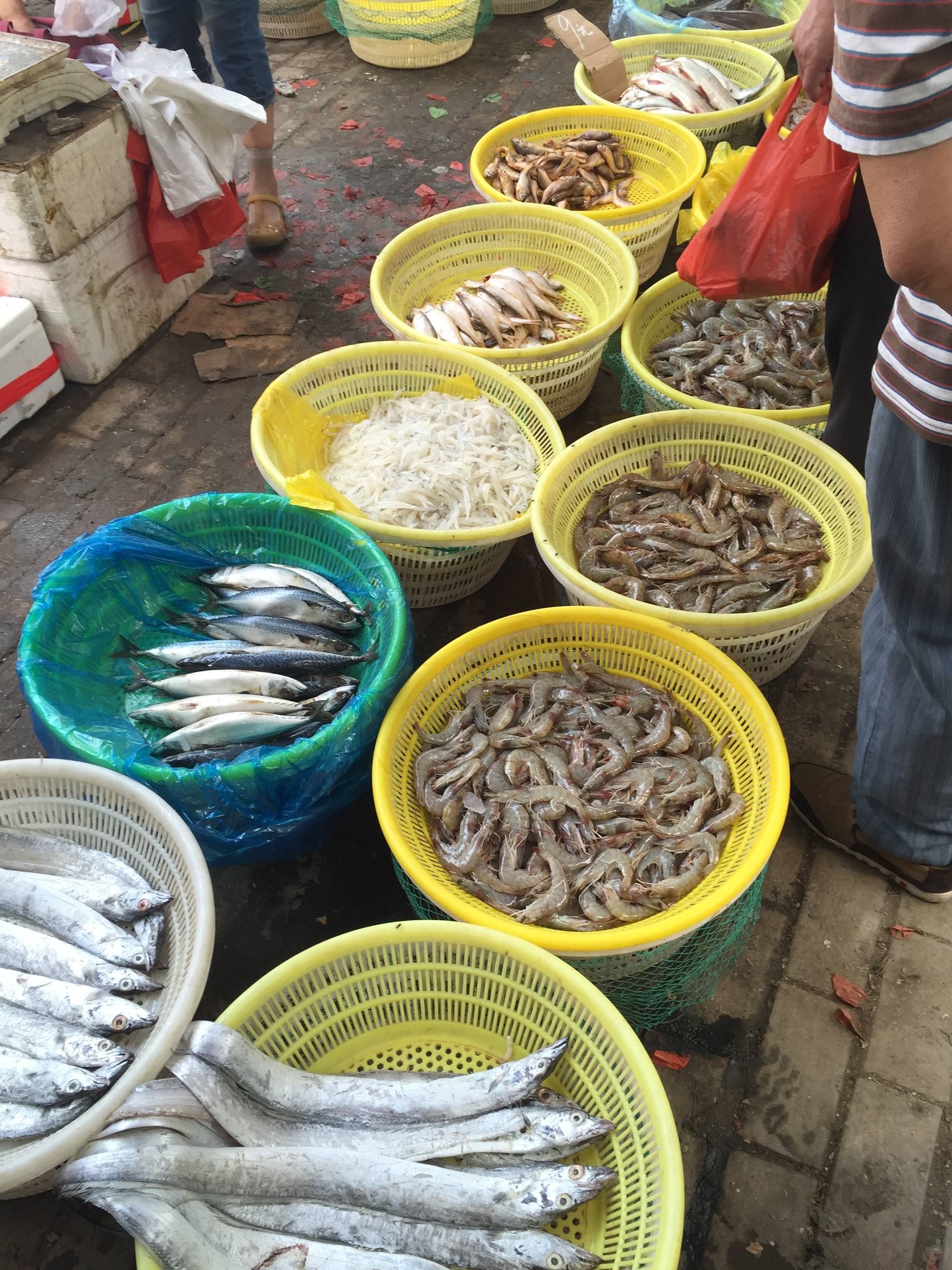 Auch jetzt im Sommer gibt es Fisch, Meeresfrüchte und Fleisch zu kaufen. Diese werden natürlich nicht gekühlt. Über dem Fleisch hängt ja ein Fliegenschutz, der sich ständig dreht – das reicht aus! Wir laufen an diesen Ständen auf jeden Fall immer schnell vorbei, da es schon ziemlich eklig riecht: