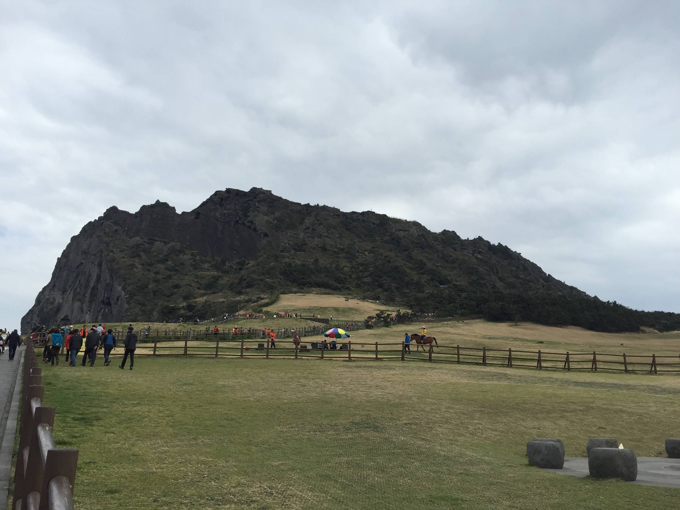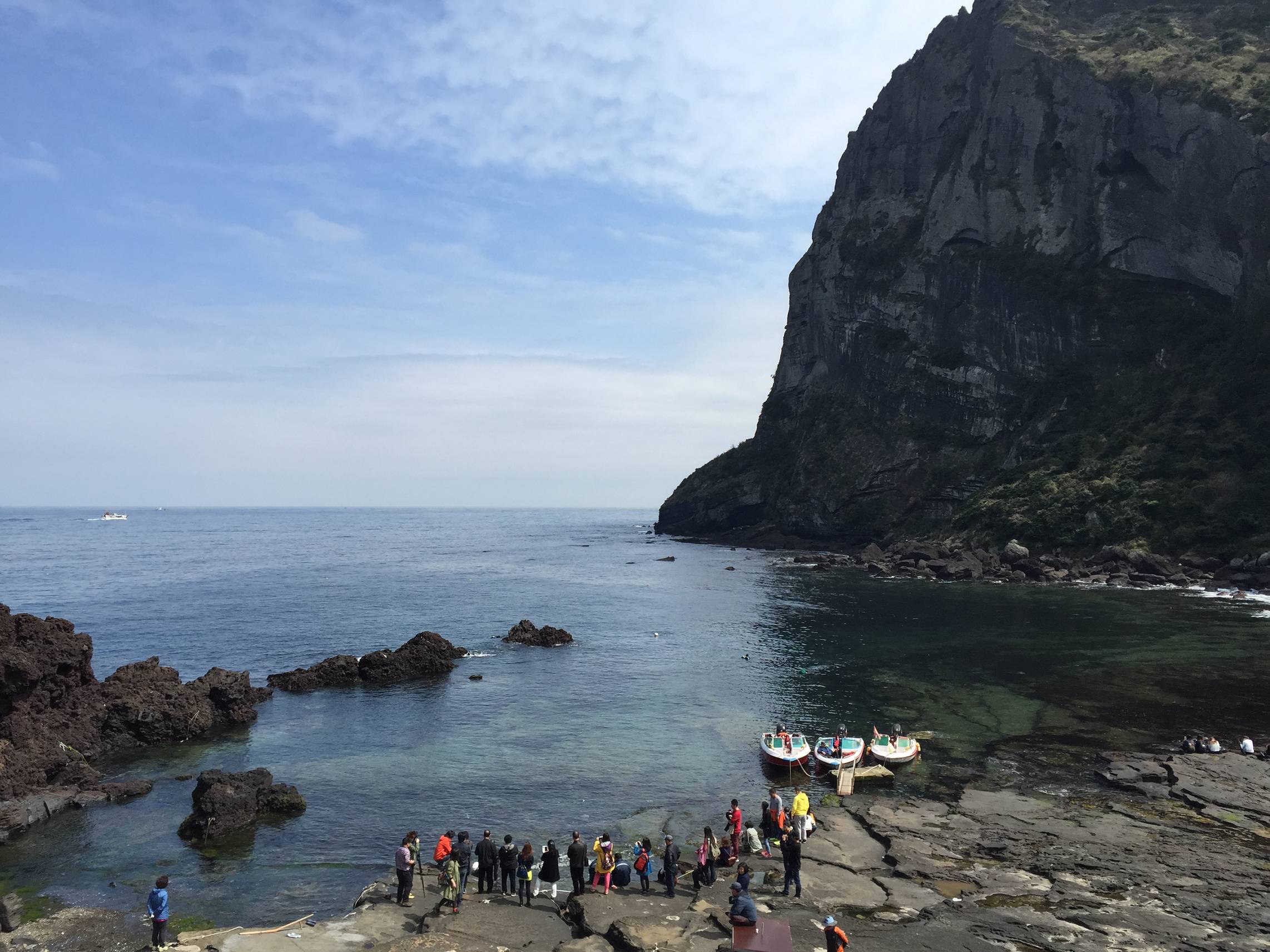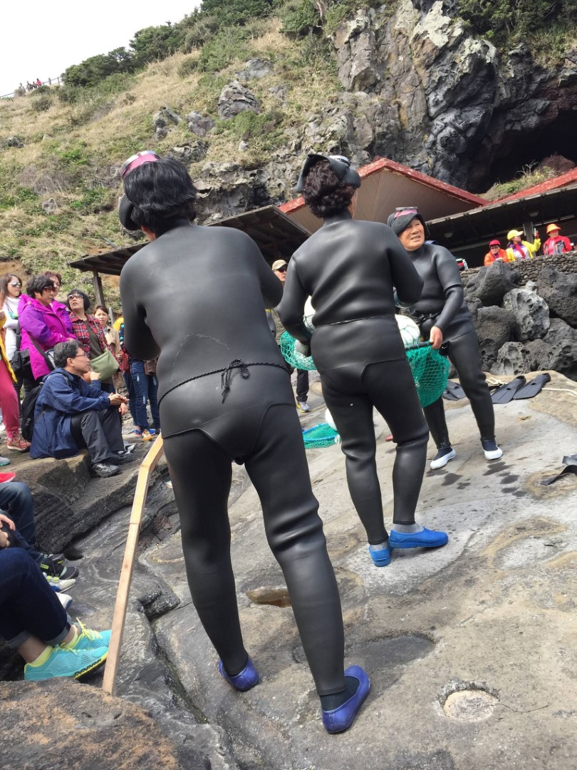 Der nächste Punkt auf der Tagesordnung war dann der Seongsan Ilchulbong Peak, UNESCO Weltnaturerbe – ein Vulkankrater, den wir in rund einer halben Stunde bestiegen. Dort oben soll der Sonnenaufgang wunderschön sein. Am Fuße des Kraters fand dann die Seefrauen-Show statt. Die Taucherinnen, die sog. haenyeo sind ein wichtiger Bestandteil der Jeju-Kultur. Die Frauen tauchen bei jedem Wetter bis zu 20 m tief ohne Tauchausrüstung und verkaufen anschließend ihren Fang um ihre Familien zu ernähren. Die älteste haenyeo ist 78 Jahre alt.
