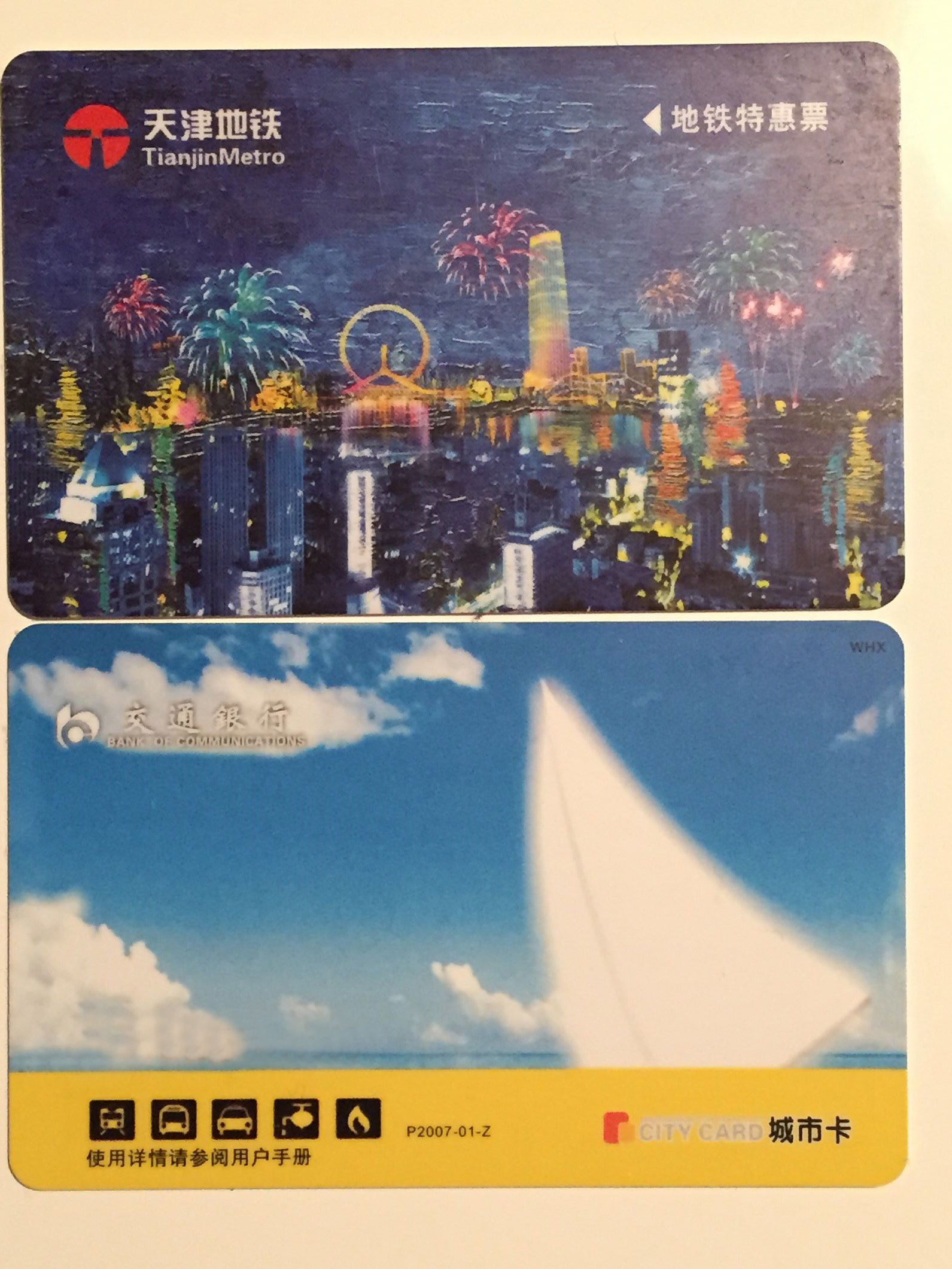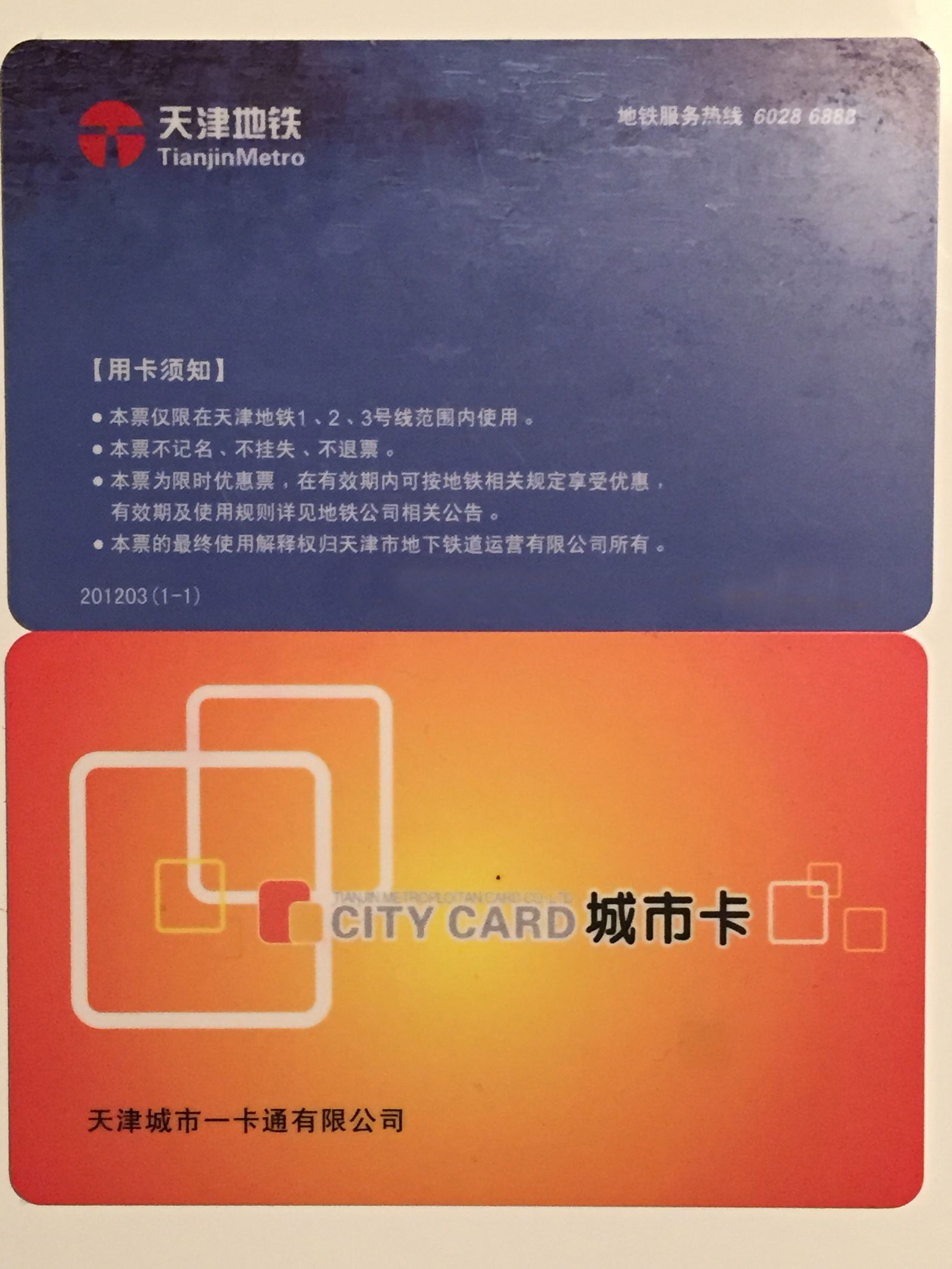 Unserer Personalabteilung hat uns (natürlich erst auf Nachfrage…) eine Tianjin Metro Card für die U-Bahn gekauft. Die Tianjin Metro Card, nicht zu verwechseln mit der Tianjin City Card, bietet ein paar Prozent Rabatt (19 %???) auf jede Fahrt, ist aber nur ein Jahr gültig und darüber hinaus nicht für die Tram-Linie 9 zu nutzen, welche direkt bei uns im Keller abfährt. Deswegen haben wir uns noch die Tianjin City Card gekauft. Beide Karten sind hier abgebildet: