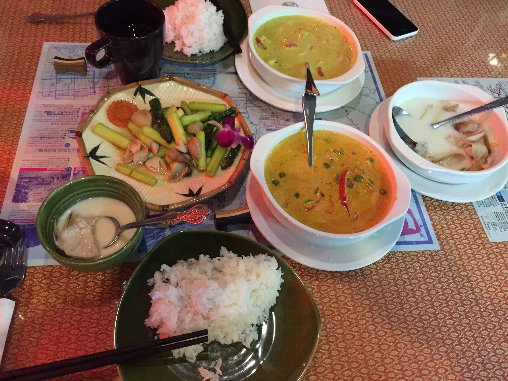 Die Gerichte waren allesamt super! Wir hatten ein gelbes Curry, rotes Curry, Frühlingsrollen, Spargelsalat und eine Kokos-Suppe mit Chicken. Und das alles für 230RMB!